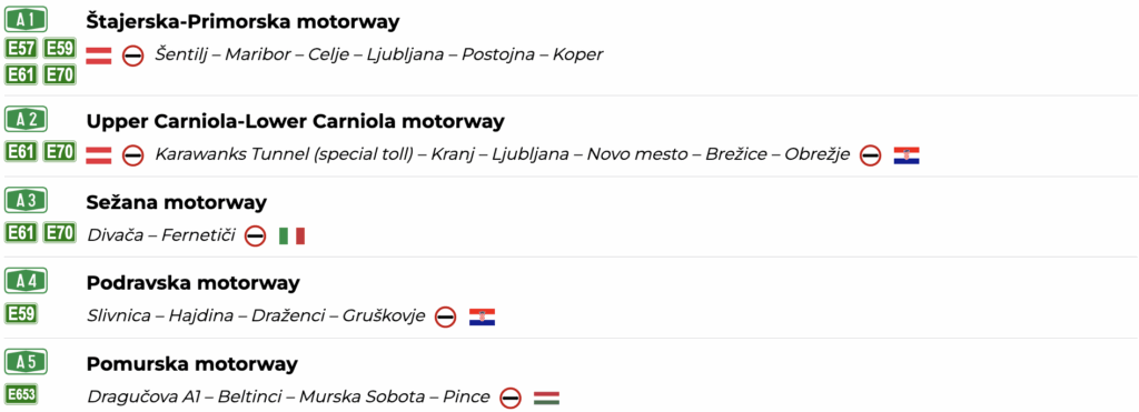 - A2 motorway: between Rosenbach (Austria) and Hrušica (Slovenia); toll is paid by using the Karawanks Tunnel